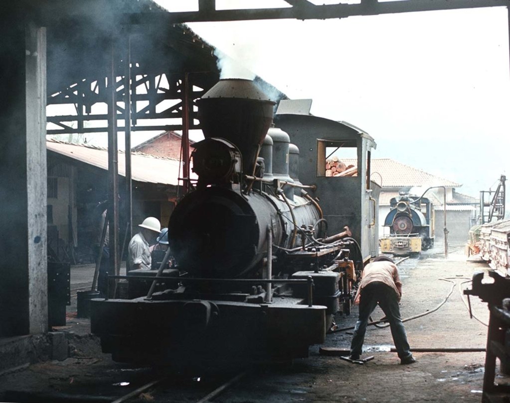 A 2-4-0 at the engine shed at Perus on the 60cm gauge EF Perus-Pirapora in September 1977. The loco in the background is no. 3, a 2-4-2ST.