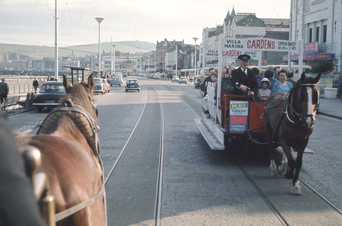 Two trams passing mid-way along the promenade at Douglas in June 1968.
