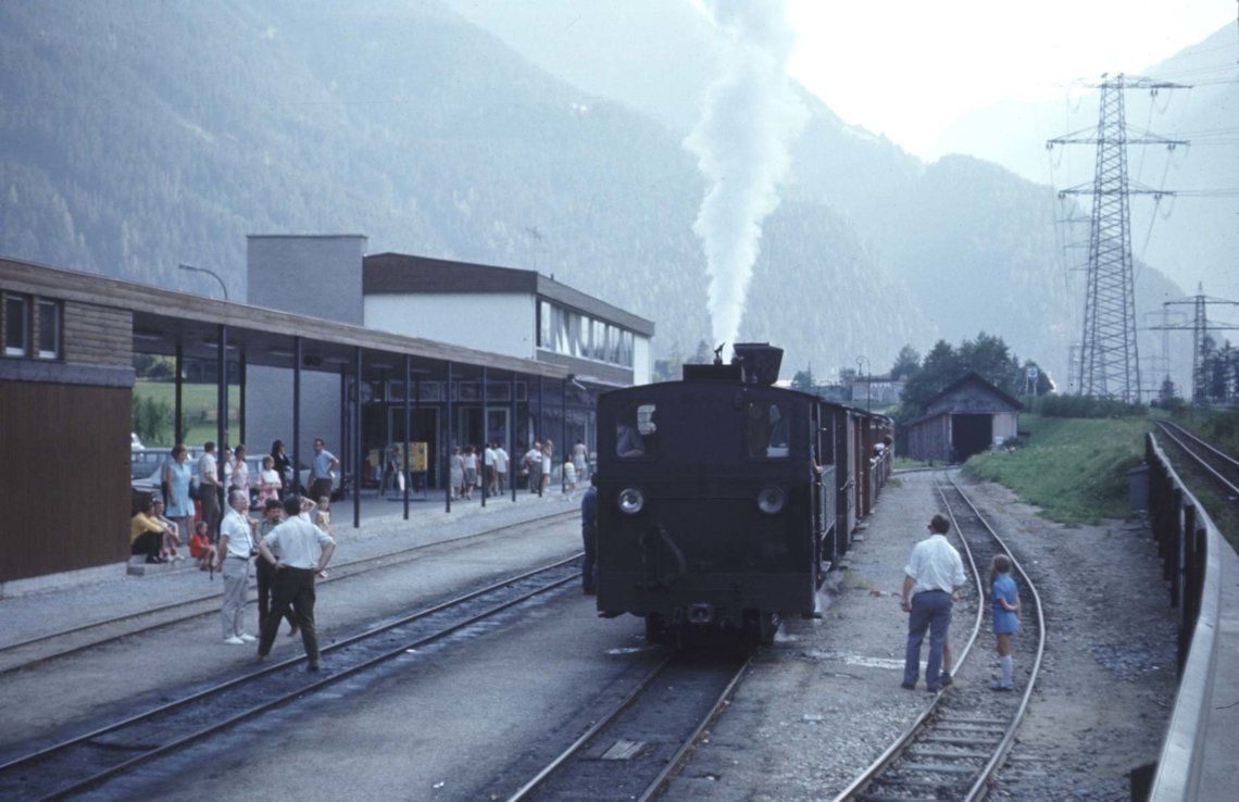 No. 2 at Mayrhofen waiting to return to Jenbach with the afternoon train in August 1971. The line on the embankment to the right continued beyond the station to a dam under construction which generated a great deal of traffic for the railway at the time.