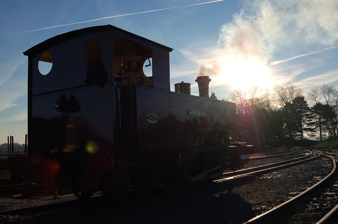 Recently re-painted Superior, raises steam outside the running shed at Whipsnade